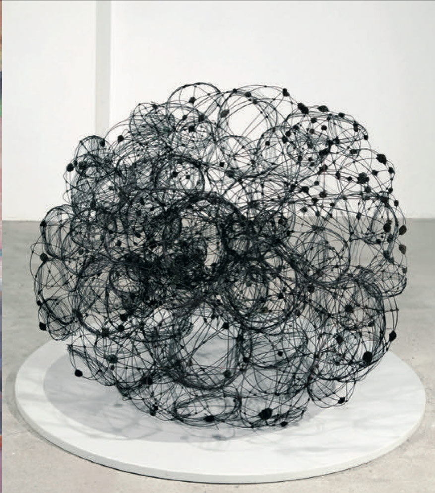 Das millimeterfeine, lineare Material wird genutzt im künstlerischen Prozess, indem Lüdicke es vielfach wickelt, kreuzt und die sich bildenden Punkte zu Knoten fixiert.