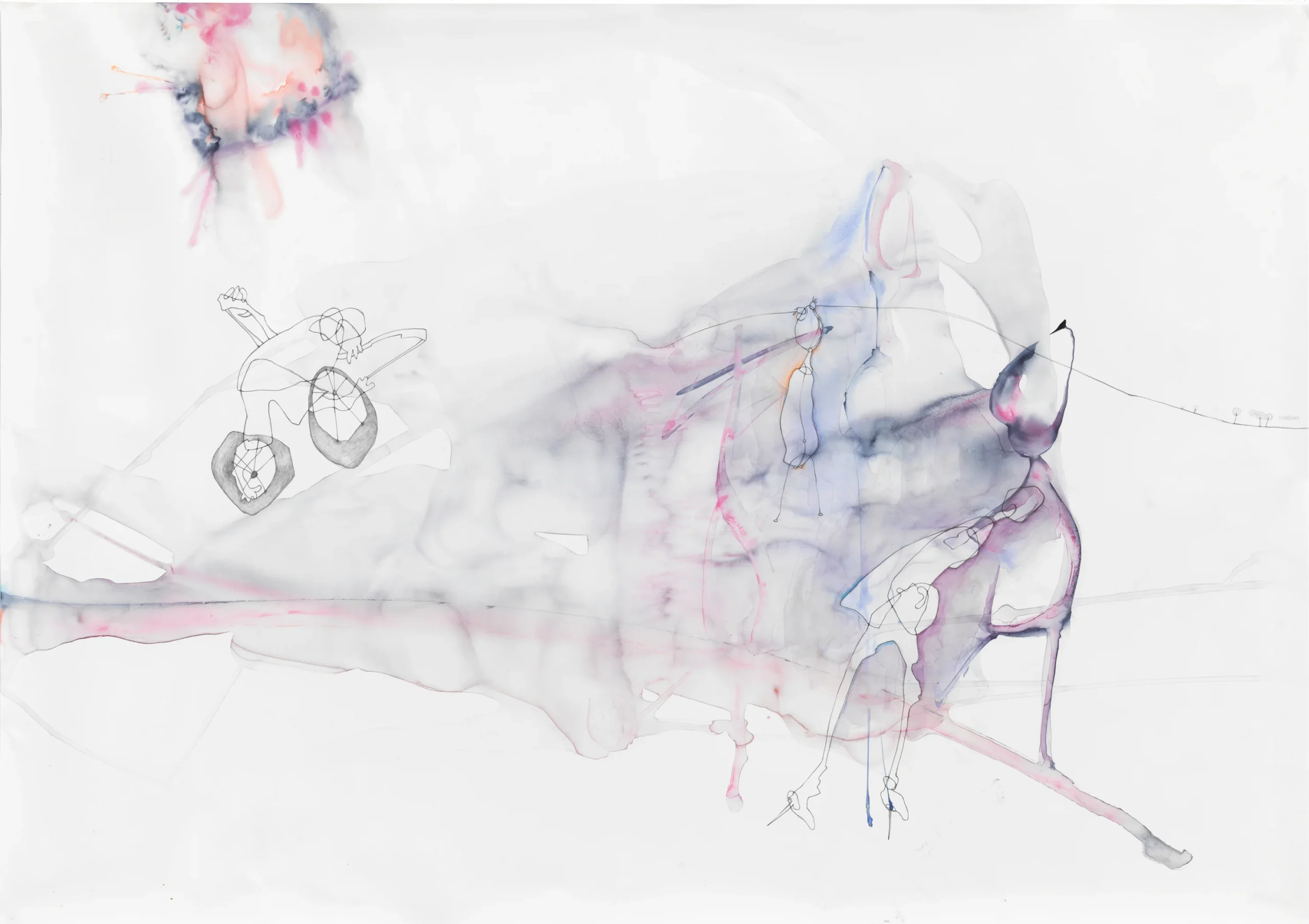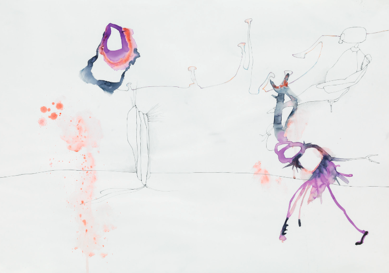 In my work I invent abstract spaces out of Chinese ink and lots of water. Within this mess I depict creatures that I developed through automatic drawing techniques, who often appear lost or ill-equipped to deal with the chaos around them. I understand my work as syndetic, which means I add things without differentiating and analyzing what’s important or better or right. This ambiguos approach is an open offer to the viewer to interpret or just relate.